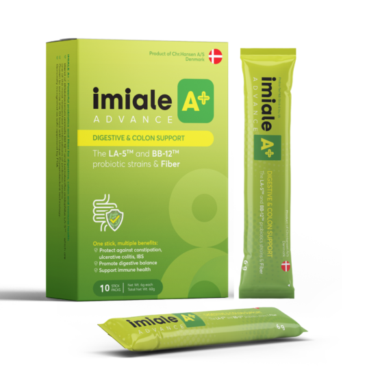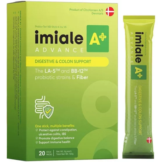 Là thành tựu của nhà sản xuất lợi khuẩn hàng đầu tại Đan Mạch, TPBVSK Imiale A+ chứa 6 tỷ lợi khuẩn sống – gắn đích – phân lập thuần khiết tới chủng: Bifidobacterium BB-12 và Lactobacillus LA-5 cùng chất xơ hòa tan Inulin. Lợi khuẩn trong Imiale A+ đã được chứng minh qua an toàn và hiệu quả trong cải thiện tiêu hóa qua hàng trăm nghiên cứu khoa học